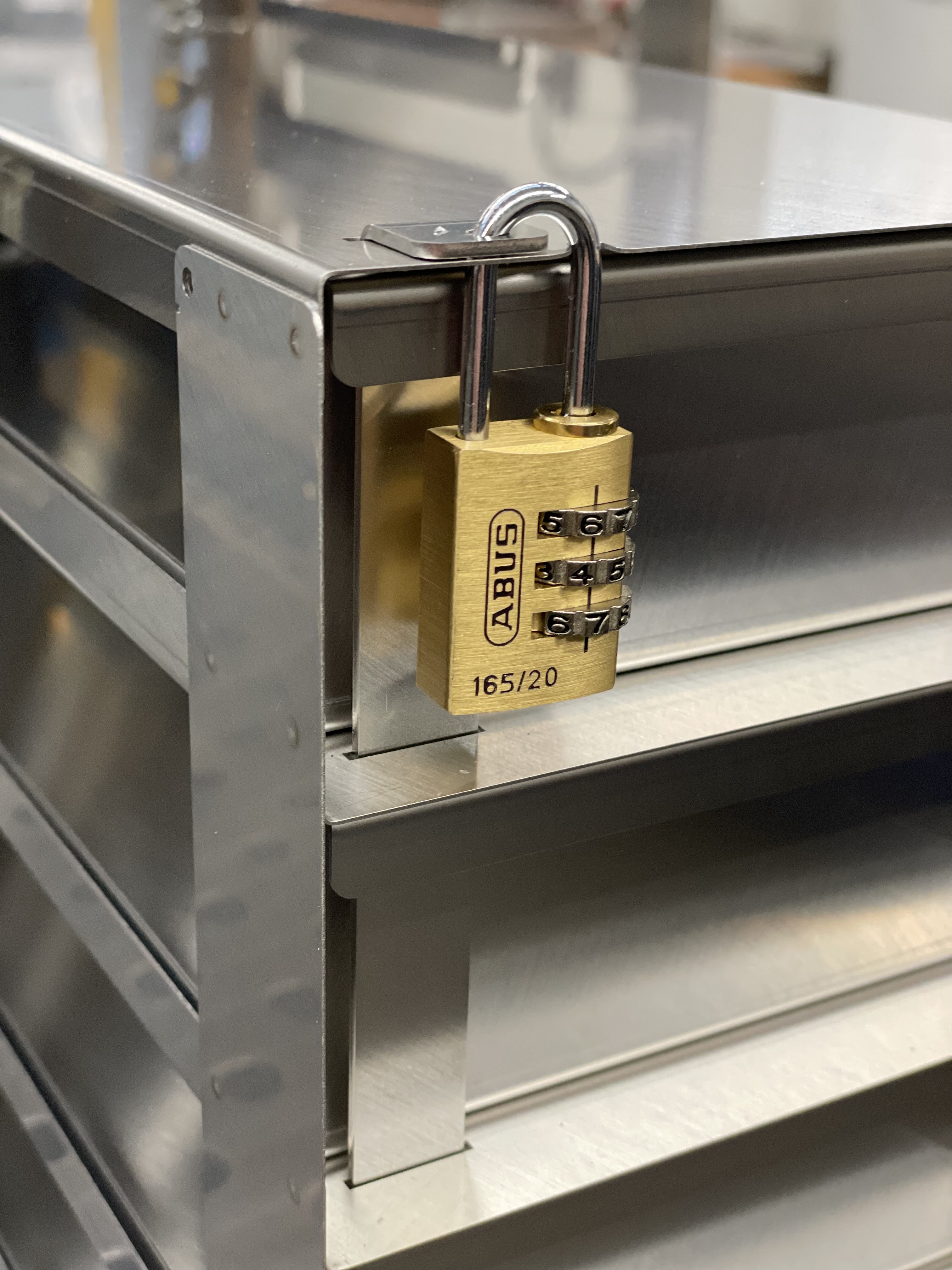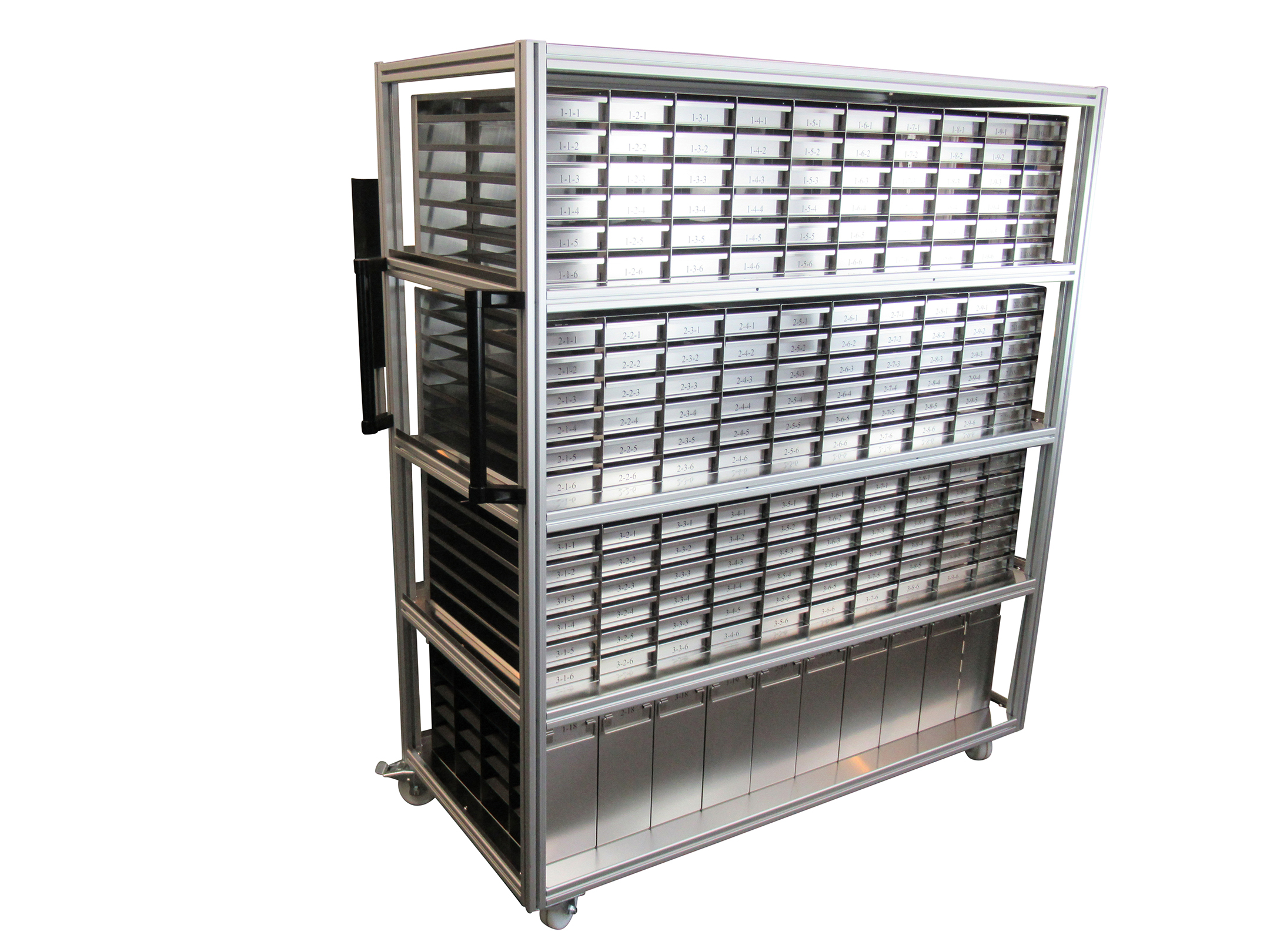 Hier wurden Kartuschen vertikal gelagert, nach Chargen unterteilt, die Schubladen zur einfachereren Identifizierung mit alphanumerischer Beschriftung versehen.