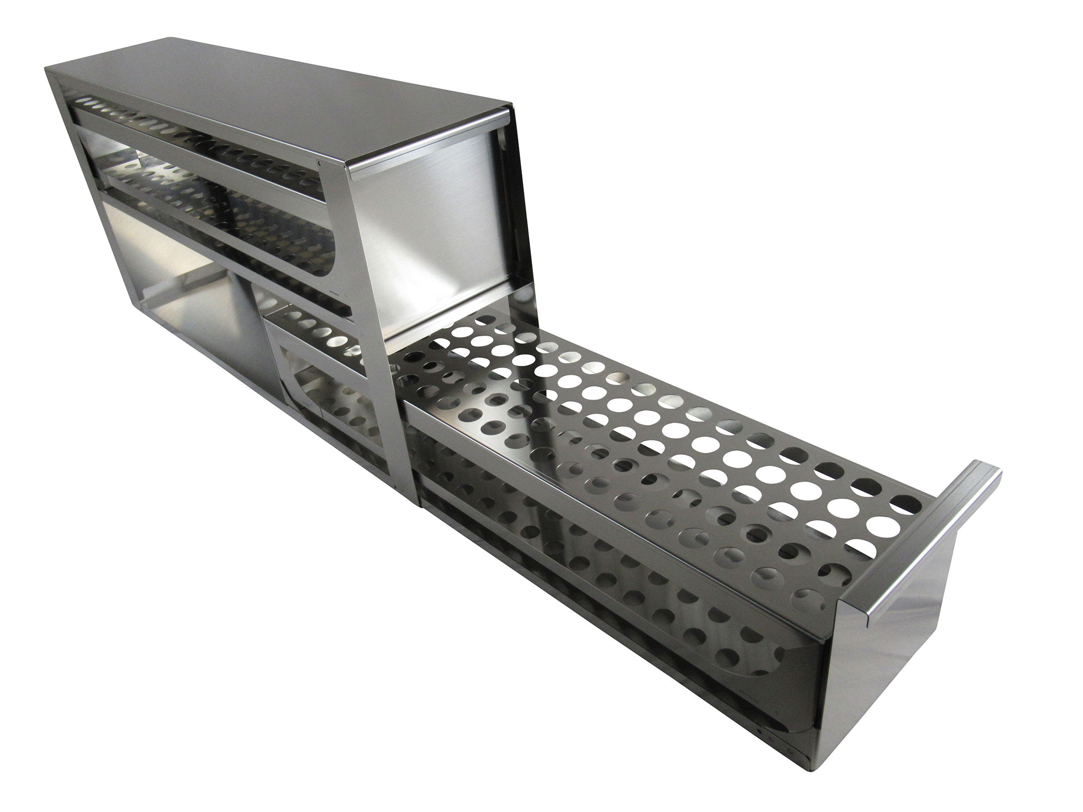 Locheinsätze für Schubladen zur direkten Lagerung von Röhrchen. Die Locheinsätze können außerdem auch entnommen und als Workbench am Arbeitsplatz benutzt werden.