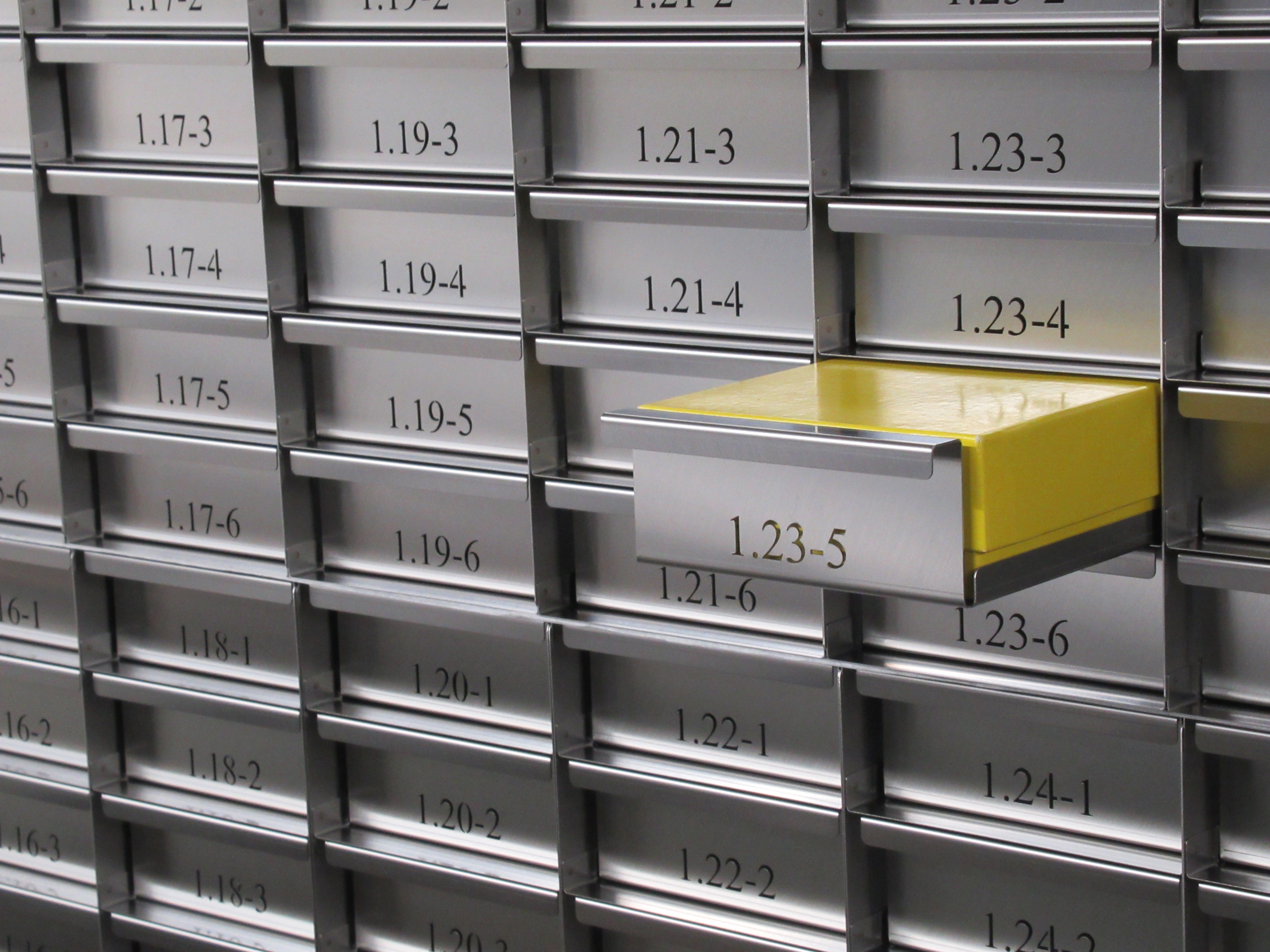 Hier wurden Kartuschen vertikal gelagert, nach Chargen unterteilt, die Schubladen zur einfachereren Identifizierung mit alphanumerischer Beschriftung versehen.